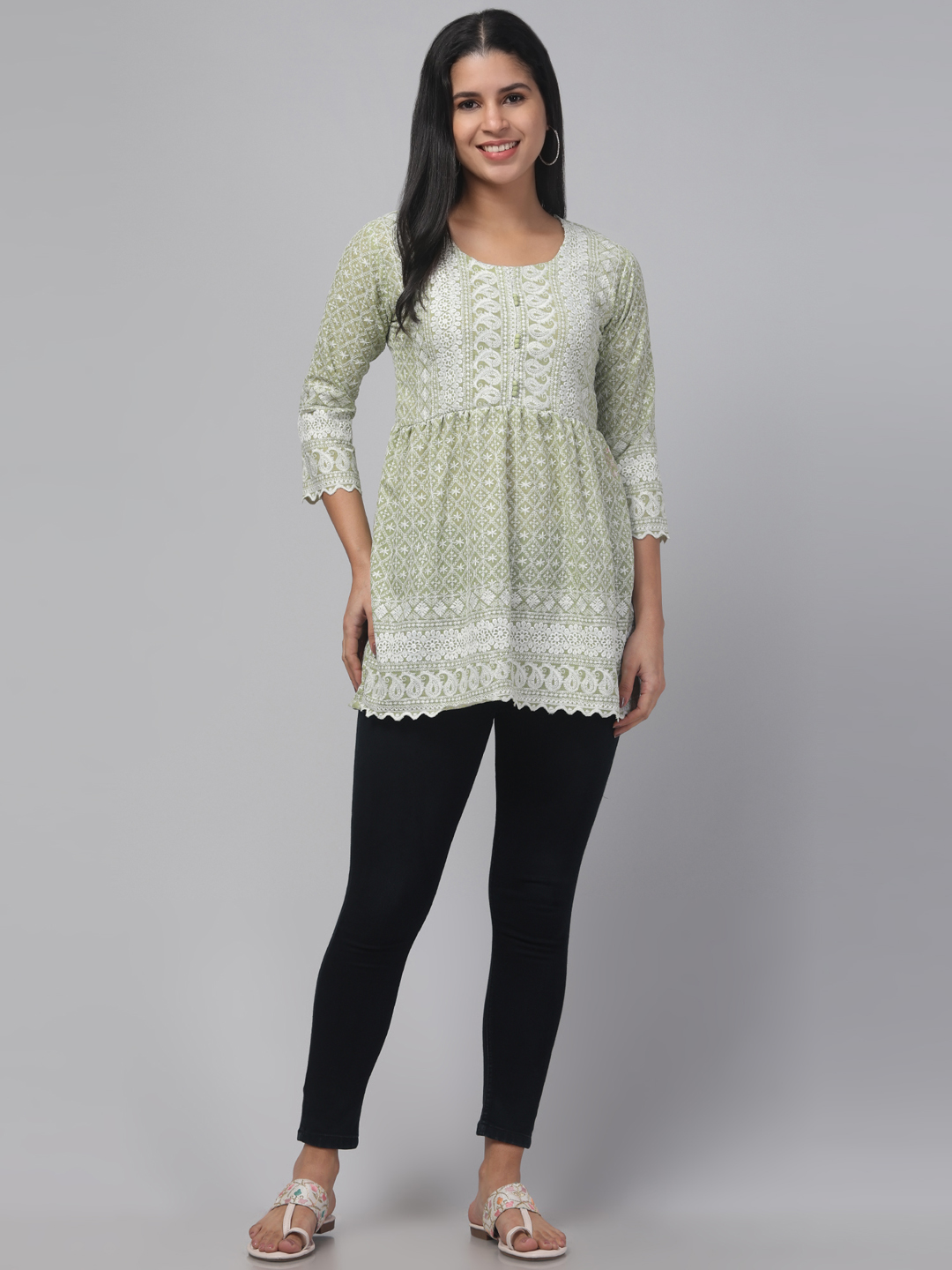TREND LEVEL Designer Short Kurti Tops for Jeans for Women I Chicken Rayon Cotton Long Kurti for Women-Olive