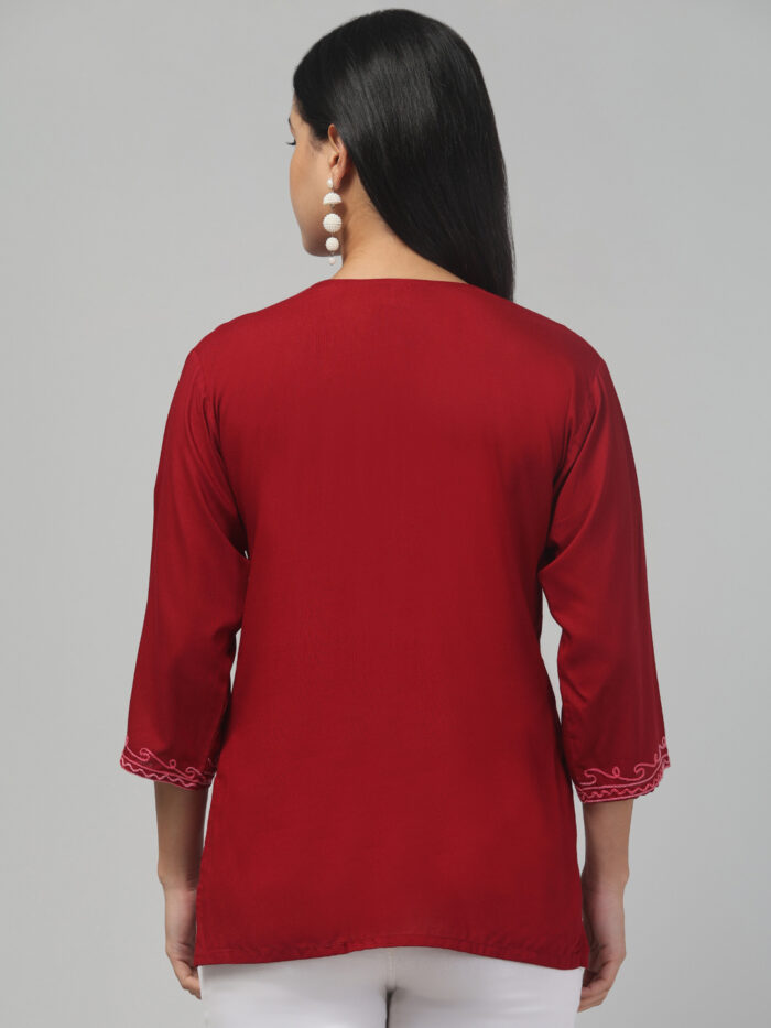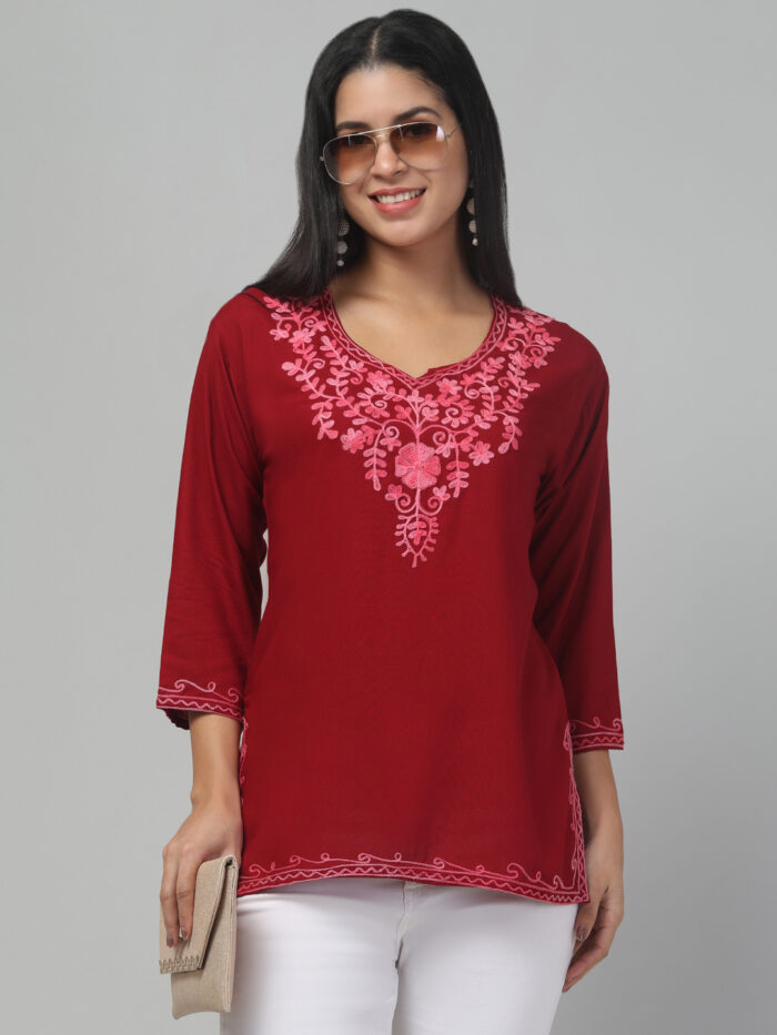 TREND LEVEL Designer Short Kurti Tops for Jeans for Women I Chikankari Rayon Cotton Long Kurta Kurti for Women I Stylish wear Kurti for Girls-Maroon-Pink