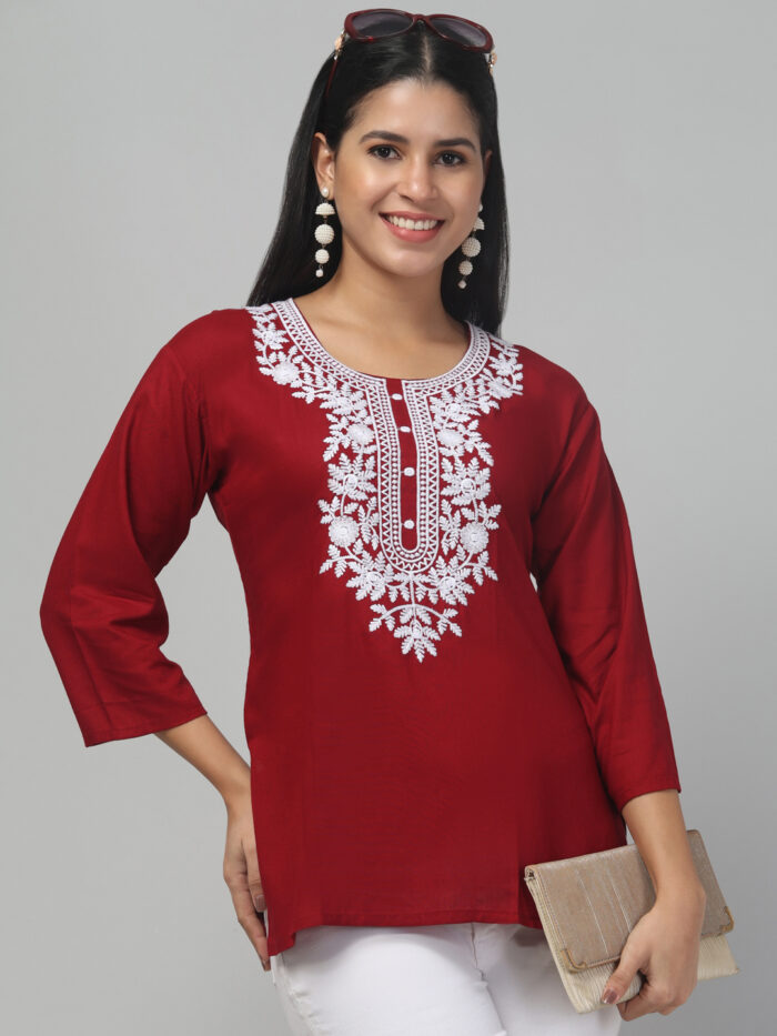 TREND LEVEL Short Kurti for Women–Lakhnowi Chikankari Embroidered Ladies Kurta, Stylish Girls Top, Ethnic Half Kurtas, Tunic Design Woman Kurtis-Maroon