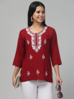 TREND LEVEL Kurti for Women Short Chikankari Kurtis for Girls, Lakhnawi Tunic Top Kurta Design for Ladies Woman Ethnic Kurtis Sleeve Plain Straight Embroidery-Maroon