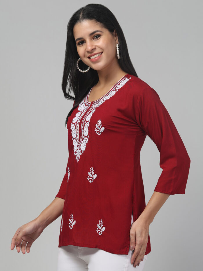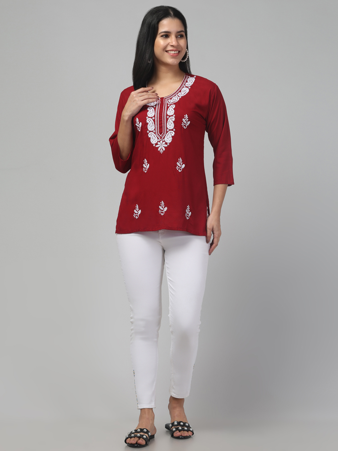 TREND LEVEL Kurti for Women Short Chikankari Kurtis for Girls, Lakhnawi Tunic Top Kurta Design for Ladies Woman Ethnic Kurtis Sleeve Plain Straight Embroidery-Maroon