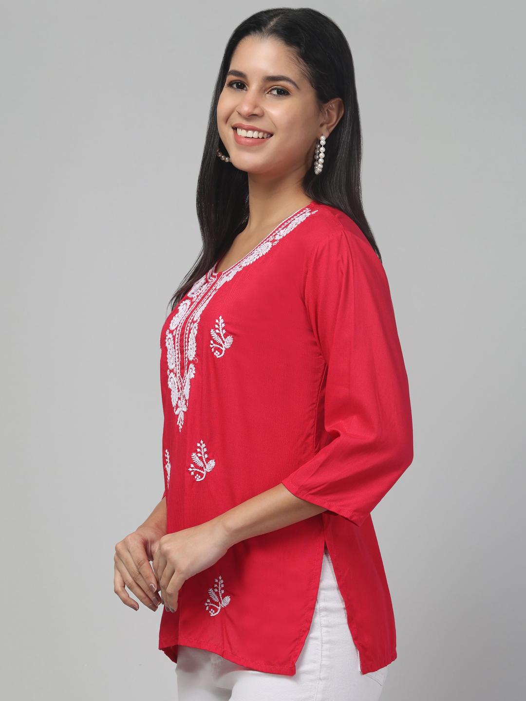 TREND LEVEL Women’s Cotton Lucknowi Embroidered Chikankari Straight Kurti | Women Short Lacknowi Kurti- Pink