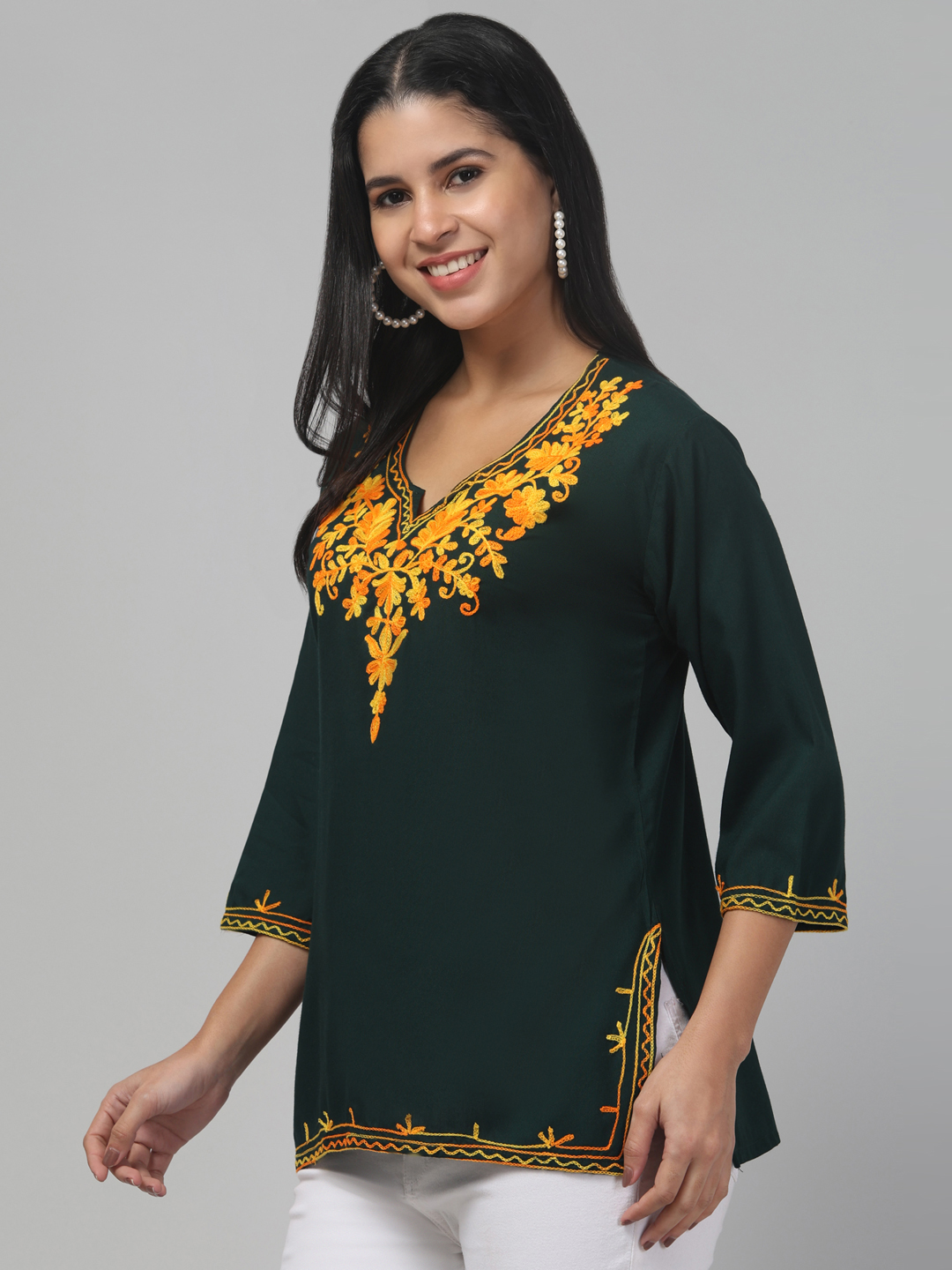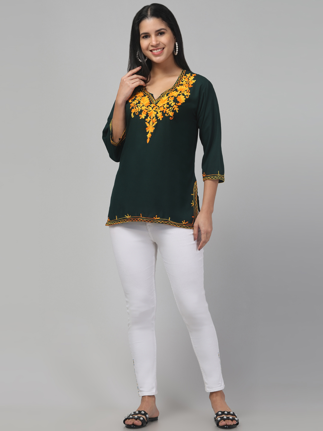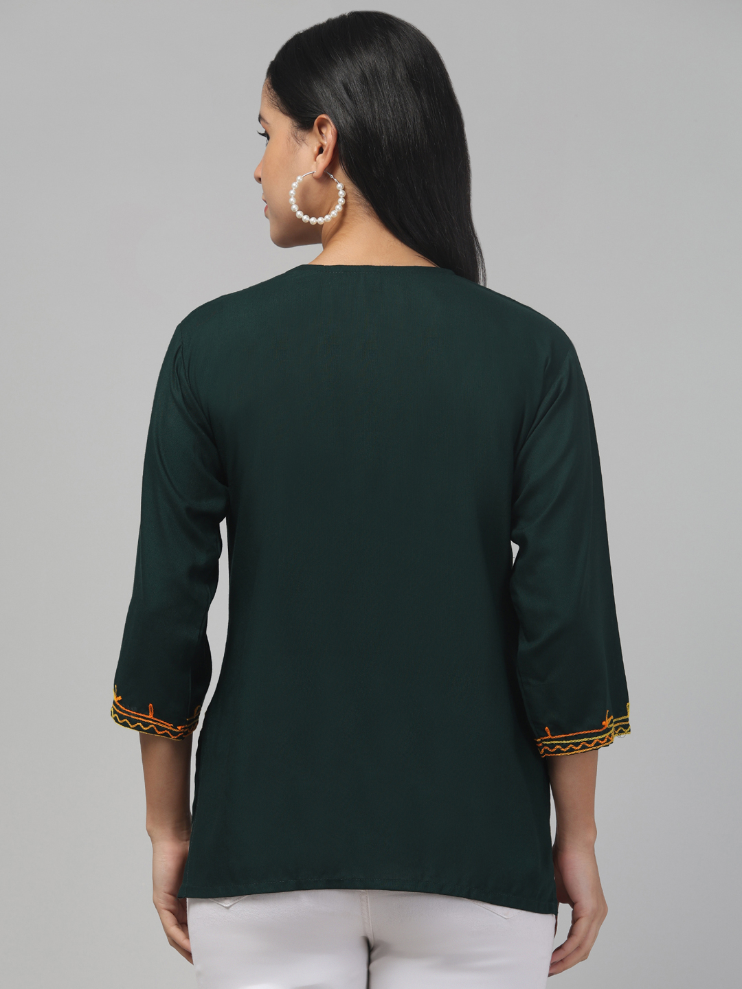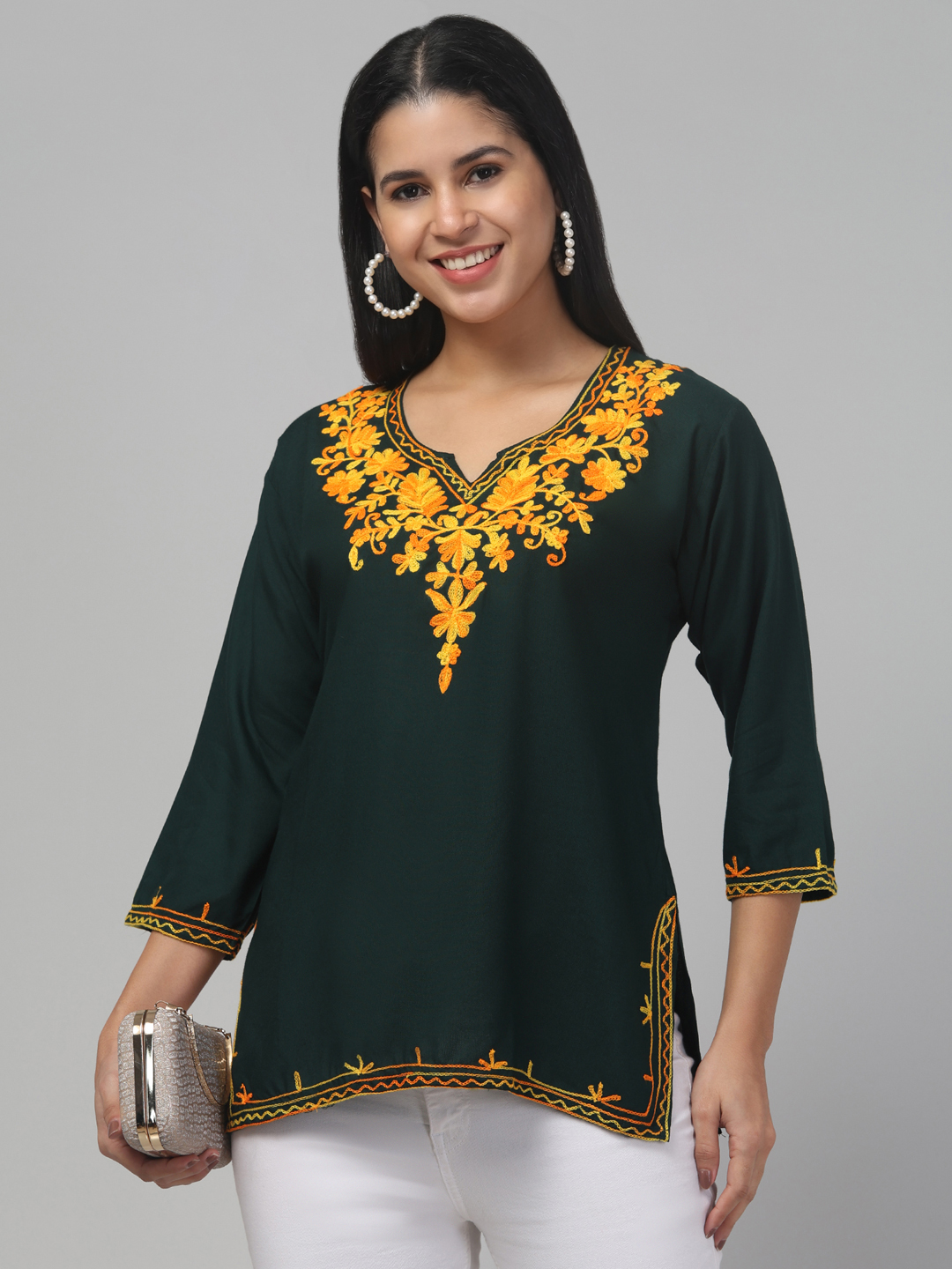 TREND LEVEL Kurti for Women Short Chikankari Kurtis for Girls, Lakhnawi Tunic Top Kurta Design for Ladies Woman Ethnic Kurtis Sleeve Plain Straight Embroidery-Dark Green