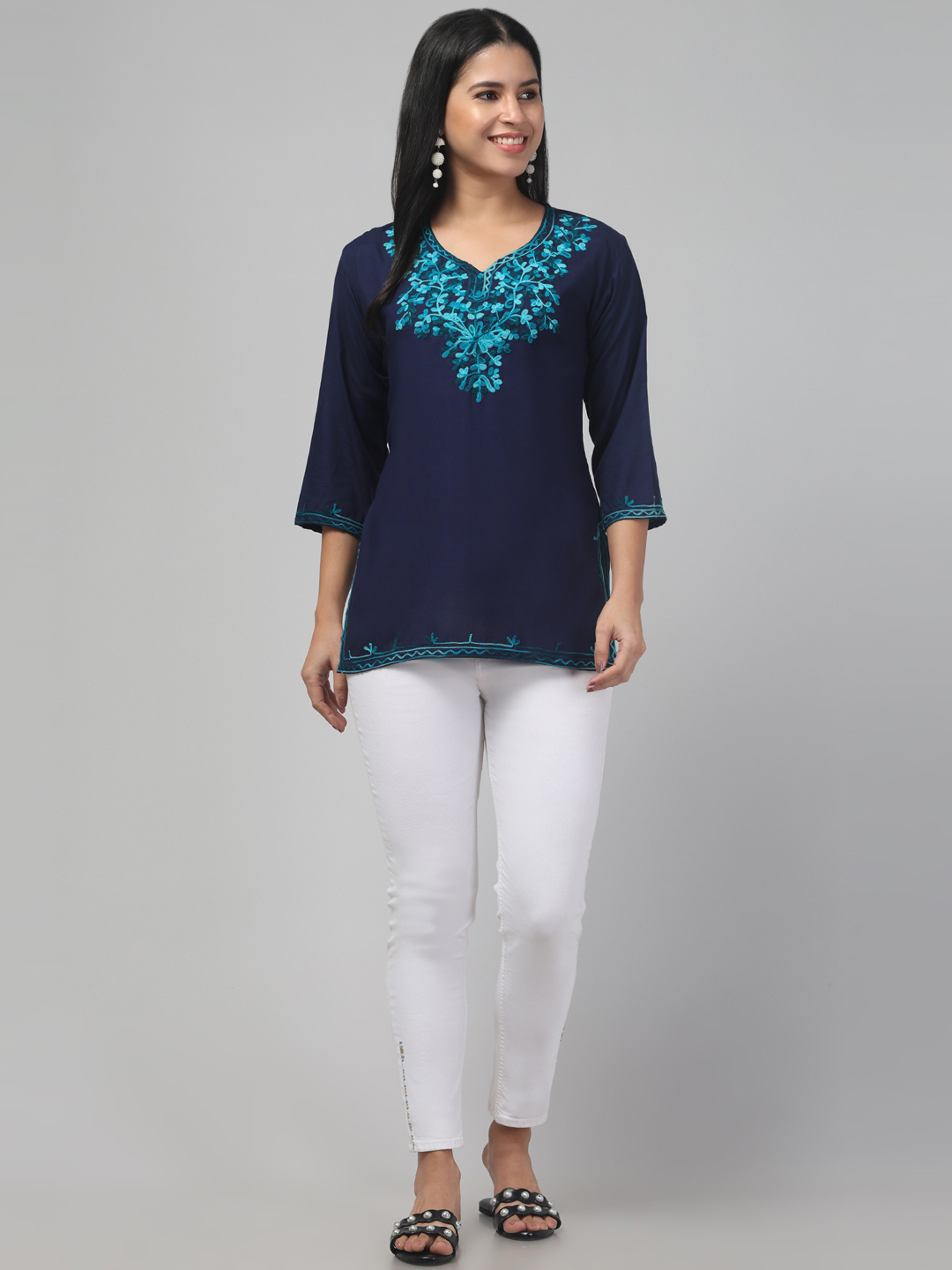 TREND LEVEL Designer Short Kurti Tops for Jeans for Women I Chikankari Rayon Cotton Long Kurta Kurti for Women I Stylish wear Kurti for Girls-Navy Blue-Mustard